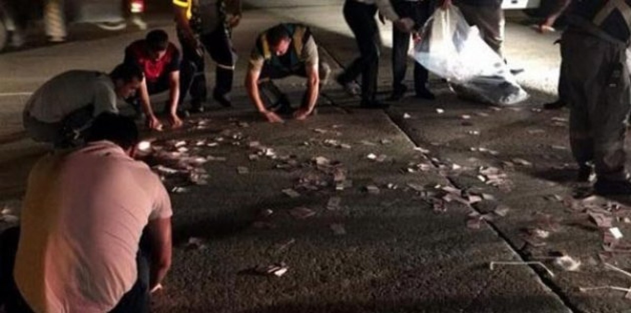 Bunlardan içinde 10'luk banknotların bulunduğu iki çuval yük taşıma traktöründen düşerek patladı. İçindeki banknotlar ise aprona saçıldı.