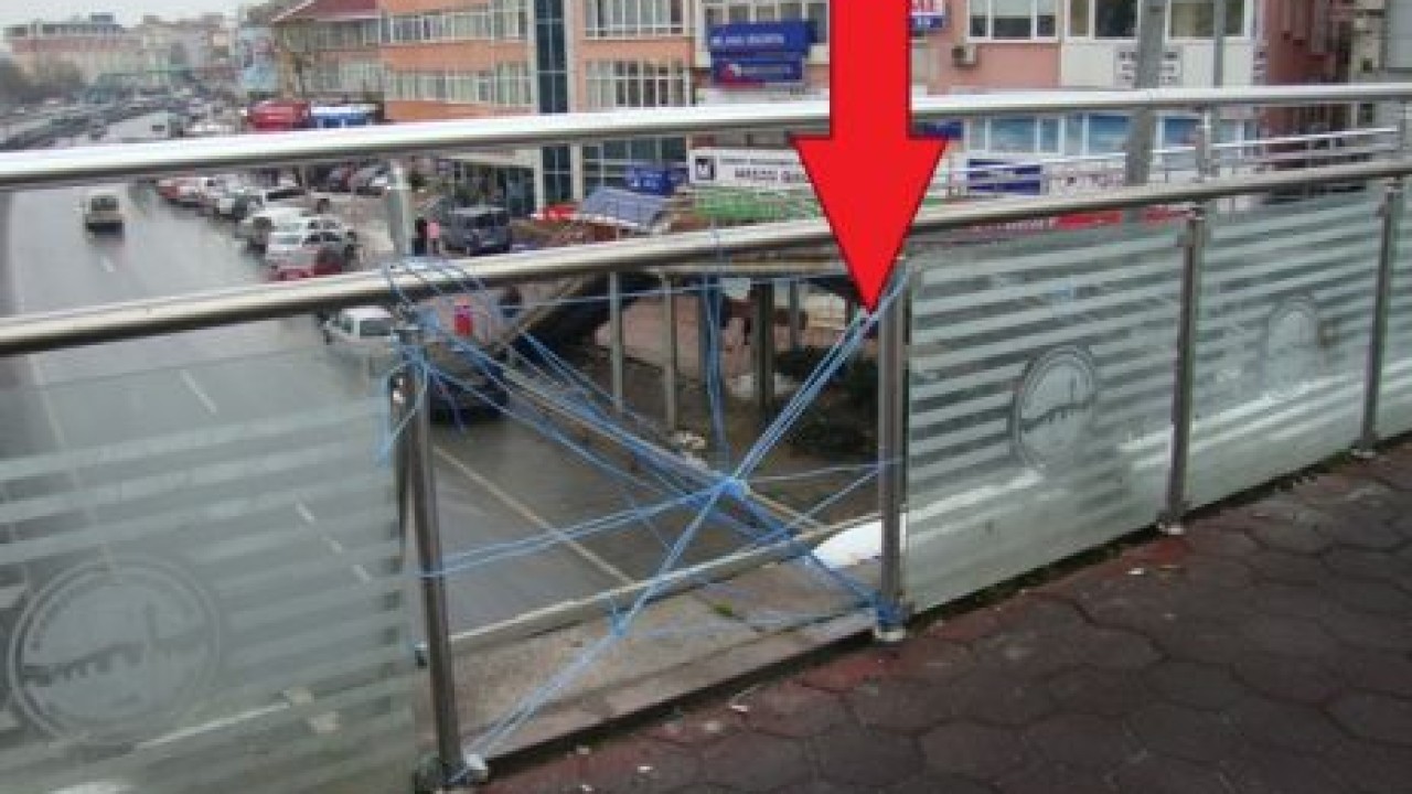 CAM KIRILDI İP BAĞLANDI!Büyükçekmece içerisinden geçen E5 üzerinde bulunan Tüyap Yaya Üstgeçidi bu günlerde tehlike saçıyor. Geçit üzerinde yer alan cisimlerin düşmesini engelleyen cam duvar soğuk havalarında etkisi ile kırılırken buraya vatandaşların kendi imkanlarınca ip bağladığı görüldü.