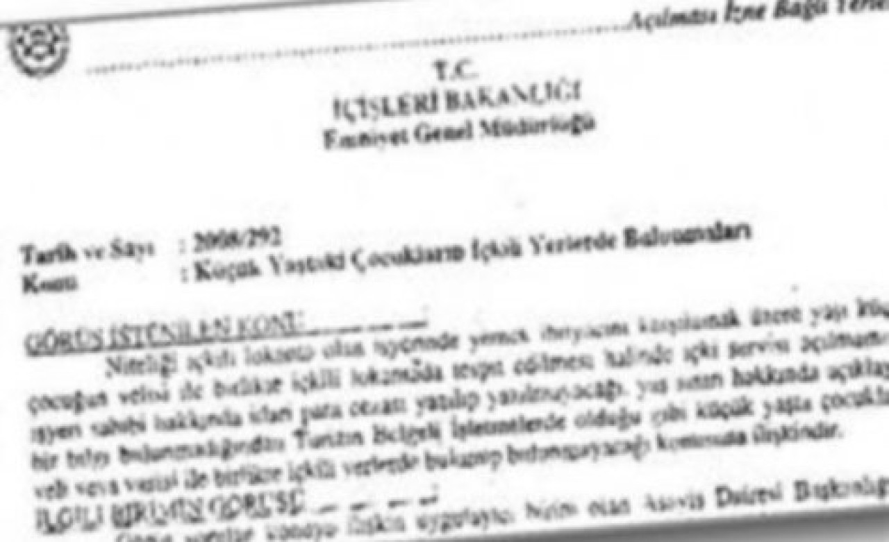 Emniyet Genel Müdürlüğü Hukuk Müşavirliği’nin 2008’te, çocukların aileleriyle birlikte içkili restoranlara gidebileceği, buraların, bar, pavyon, gazino, meyhane gibi içkili yerlerden olmadığı görüşünü açıkladığı ortaya çıktı. Ankara Çayyolu ve Aydın’daki bir alışveriş merkezindeki restoranlara, ailelerinin yanında giden çocukların kimliklerinin alınarak, işyerlerine ceza yazılmasının ise oluşturulan bu görüşe rağmen gerçekleştirildiğini anlaşıldı.