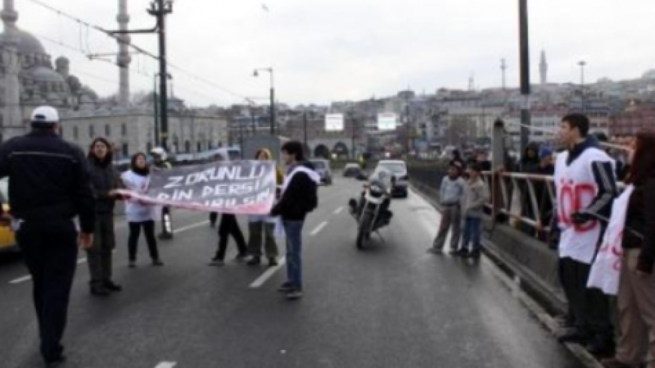 Liseli Öğrenci Birliği’ne üye 8 eylemci, saat 12.30 sıralarında Galata Köprüsü üzerine gelerek zorunlu din dersinin seçmeli hale getirilmesi için protesto eylemi yaptı. İkisi kadın 3 eylemci arkadaşlarının yardımıyla kendilerini köprünün korkuluklarına zincirledi. 5 eylemci de yanlarında getirdikleri ve üzerinde "Zorunlu din dersi kaldırılsın" yazılı pankartı açarak köprünün ortasında slogan atmaya başladı.