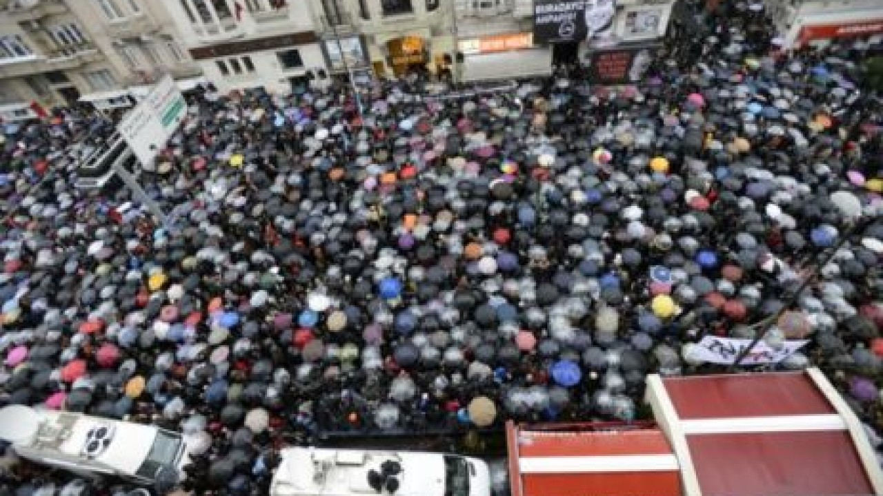 Yağmur altında toplanan çok sayıda kişi, yürüyerek Agos’un önüne geldi. Çeşitli dövizler taşıyan grup, sık sık adalet için sloganlar attı.