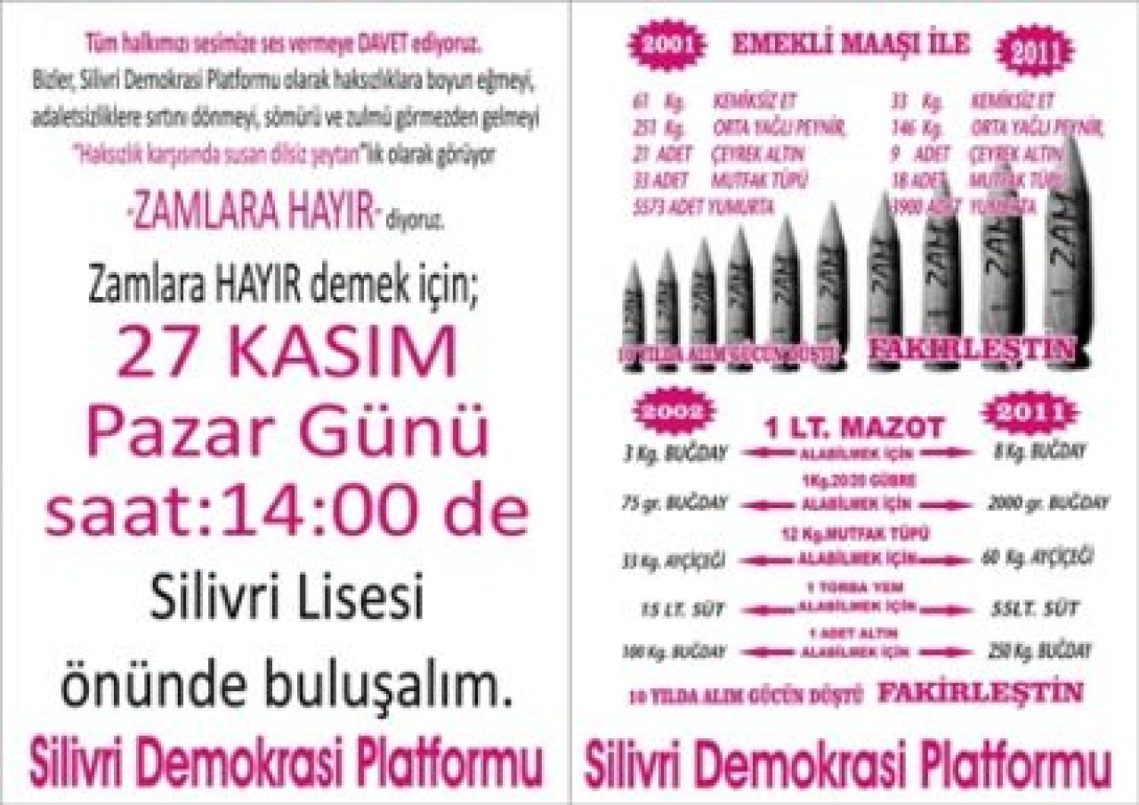 Bizler, Silivri Demokrasi Platformu olarak haksızlıklara boyun eğmeyi, adaletsizliklere sırtını dönmeyi, sömürü ve zulmü görmezden gelmeyi “Haksızlık karşısında susan dilsiz şeytan”lık olarak görüyor “ZAMLARA HAYIR” diyoruz.