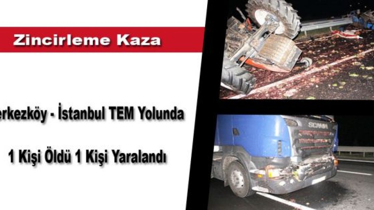 Çerkezköy-İstanbul TEM Bağlantı Yolu’nda seyrederken, şerit değiştirmek isteyen traktöre, aynı yönden gelen TIR çarptı. Çarpmanın etkisiyle sol şeride savrulan traktör ve römork, aynı yönde seyreden BMW’nin üzerine düştü. Her 3 aracın da hurdaya döndüğü kazada, traktör sürücüsü hayatını kaybederken, yaralanan BMW sürücüsü de hastaneye kaldırıldı.