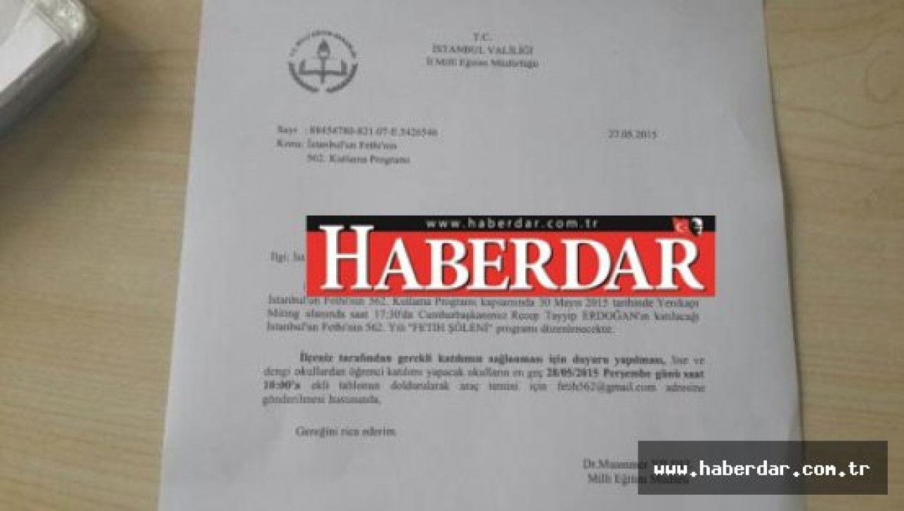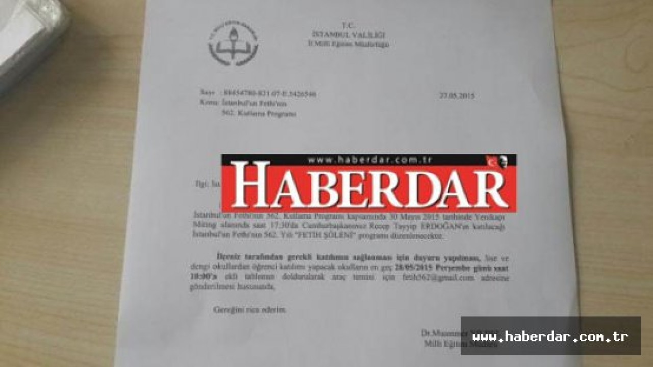 “İstanbul Valiliği ve İstanbul Büyükşehir Belediye Başkanlığı tarafından düzenlenen İstanbul’un Fethi’nin 562. Kutlama Programı kapsamında 30 Mayıs 2015 tarihinde Yenikapı miting alanında saat 17.30’da Cumhurbaşkanımız Recep Tayyip Erdoğan’ın katılacağı İstanbul’un fethinin 562. yılı ‘Fetih Şöleni’ programı düzenlenecektir. İlçeniz tarafından gerekli katılımın sağlanması için duyuru yapılması, lise ve dengi okullardan öğrenci katılımı yapacak okulların en geç 28 Mayıs 2015 Perşembe günü saat 10.00’a ekli tablonun doldurularak araç temini için [email protected] adresine gönderilmesi hususunda gereğini rica ederim.”