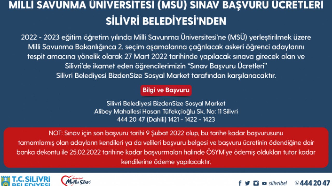 Silivri Belediye Başkanı Volkan Yılmaz’ın eğitime destek projeleri kapsamında 2022-2023 eğitim öğretim yılında Milli Savunma Üniversitesi’ne (MSÜ) yerleştirilmek üzere Milli Savunma Bakanlığınca 2. seçim aşamalarına çağrılacak askeri öğrenci adaylarını tespit amacına yönelik olarak 27 Mart 2022 tarihinde yapılacak sınava girecek Silivri’de ikamet eden öğrencilerin “Sınav Başvuru Ücretleri” Silivri Belediyesi BizdenSize Sosyal Market tarafından karşılanacak. Konuya ilişkin bilgi veren Başkan Yılmaz, “Silivri Belediyesi olarak ilçemizde yaşayan öğrencimize destek vermeye, onların eğitim giderlerine katkıda bulunmaya devam ediyoruz. Milli Savunma Üniversitesi’ne girmek için başvuru yapan öğrenci adayları için düzenlenecek sınav ücretini BizdenSize Sosyal Marketimiz aracılığı ile karşılayacağız. Duyurumuzdan önce başvuru yapmış ve ÖSYM'ye ödemesini yapmış olan öğrencilerimiz dekontları ile BizdenSize Sosyal Markete başvurarak ödemiş oldukları tutarı alabilecekler. Sınava girecek olan tüm öğrencilerimize başarılar diliyorum.” dedi.
