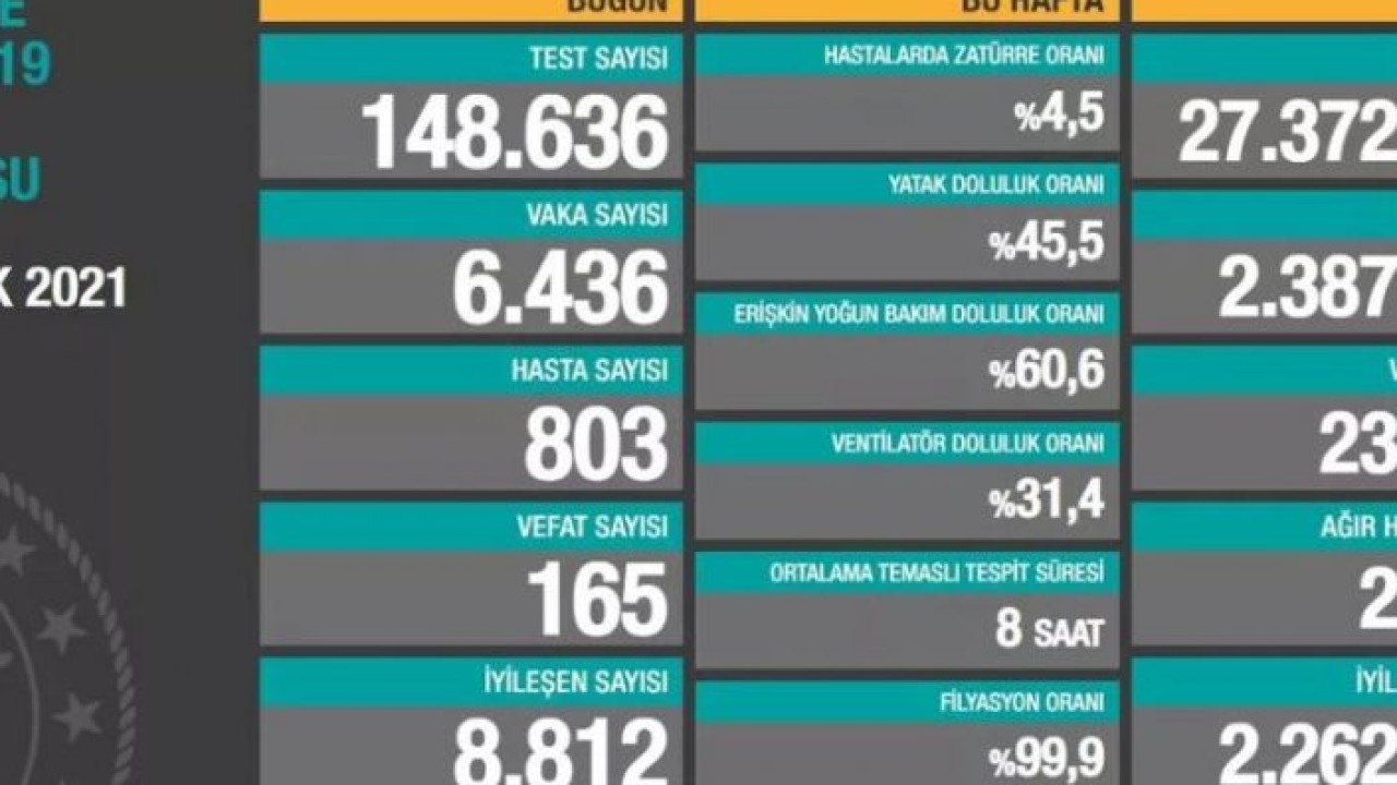Haftalık verilere göre, bu hafta hastalarda zatürre oranı yüzde 4,5, yatak doluluk oranı yüzde 45,5, erişkin yoğun bakım doluluk oranı yüzde 60,6, ventilatör doluluk oranı yüzde 31,4, ortalama temaslı tespit süresi 8 saat, filyasyon oranı ise yüzde 99,9 olarak kayıtlara geçti.
