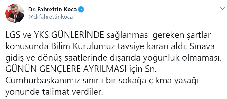 "LGS ve YKS günlerinde sağlanması gereken şartlar konusunda Bilim Kurulumuz tavsiye kararı aldı. Sınava gidiş ve dönüş saatlerinde dışarıda yoğunluk olmaması, günün gençlere ayrılması için Cumhurbaşkanımız sınırlı bir sokağa çıkma yasağı yönünde talimat verdiler"