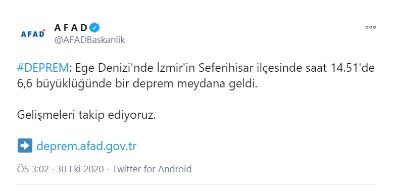 #DEPREM: Ege Denizi'nde İzmir'in Seferihisar ilçesinde saat 14.51'de 6,6 büyüklüğünde bir deprem meydana geldi. Gelişmeleri takip ediyoruz.