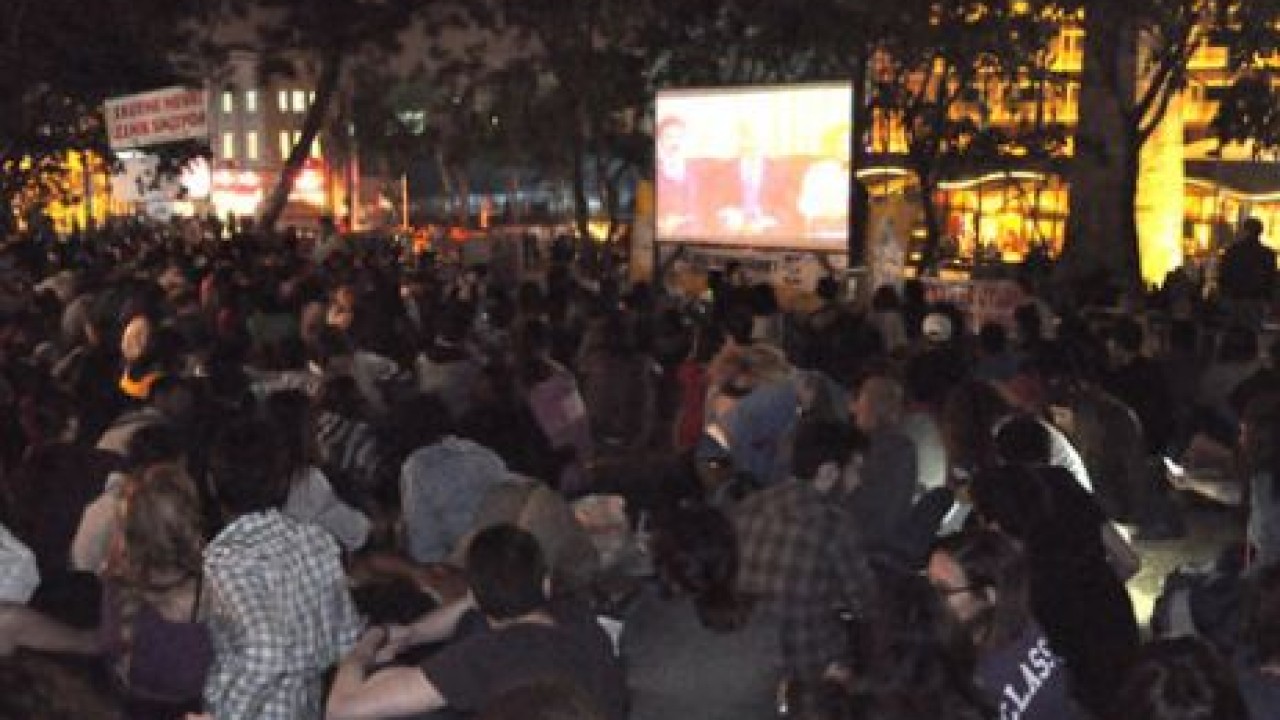 Akşam saatlerinde yoğun kalabalığın yaşandığı Gezi Parkında eylemciler alanda kurduğu projeksiyon sistemi ile beyaz perdede sinema keyfi yaşadı. Yoğunluk nedeniyle yer bulmakta zorlanan eylemciler sinema alanında hep birlikte ‘Neşeli Günler’ adlı filmi izleyerek keyifli dakikalar geçirdi. Geçtiğimiz günlerde yoğun polis müdahalesinin yaşandığı Dolmabahçe ve Gümüşsuyu Caddeleri de sakindi. Gezi parkında eylemcilerin bekleyişi sürüyor.