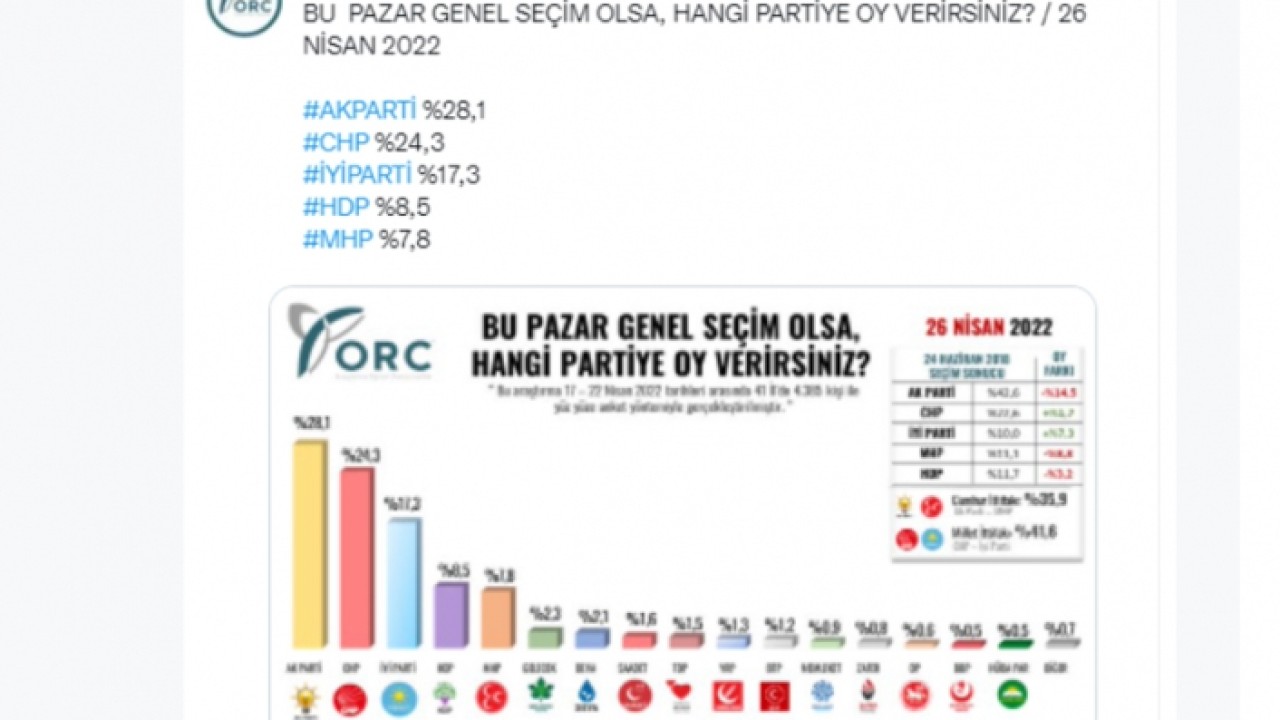 Yaklaşan seçimler öncesi çalışmalarına hız veren araştırma şirketleri, peş peşe anket sonuçlarını paylaşmaya devam ediyor. AKP'ye yakınlığı ile bilinen ORC Araştırma, 17-22 Nİsan tarihleri arası 41 ilde yüz yüze gerçekleştirdiği anketin sonuçlarını paylaştı.