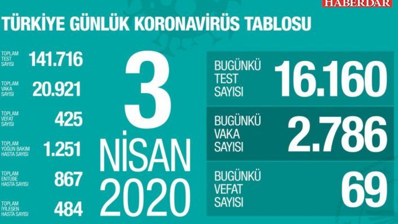 Bakanlığın verilerine göre bugünkü test sayısında da büyük artış gözlemlendi. Son 24 saatte 16 bin 165 test yapıldı ve 2 bin 786 yeni vaka tespit edildi. Açıklanan son rakamlarla birlikte Türkiye'de koronavirüs nedeniyle hayatını kaybedenlerin sayısı 425'ya, toplam vaka sayısı ise 20 bin 921'e yükseldi.