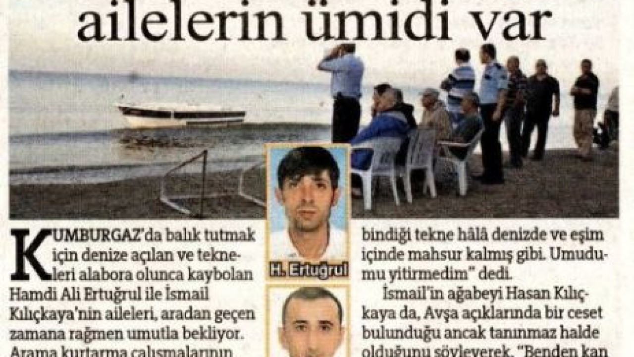 İsmail’in ağabeyi Hasan Kılıçkaya (42) da, Avşa açıklarında bir ceset bulunduğu ancak tanınmaz halde olduğunu söyleyerek, “Benden kan örneği alındı. Kemik otopsisine bakacaklar. Umudumuzu yitirmedik” diye konuştu. Esenler’de beraber büyüyen 5 arkadaş, 26 Ağustos’ta denize açılmış, turizmci Şener Karataş (38) ile birlikte Taksici Metin Şahin (34), İsmail Kılıçkaya (36), Hamdi Ali Ertuğrul (35) ve kalıpçı Bülent Balta’nın (38) bindiği tekne alabora olmuştu. Balta, olaydan 5 saat sonra kıyıya çıkmış, ekipler Karataş’ın ve Şahin’in ise cesedine ulaşmıştı.