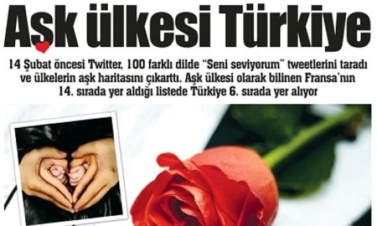 sıralamayı ve da gözler önüne serdi. Bu harita insanların dünya üzerinde 100 farklı dilde nasıl ‘seni seviyorum’ dediklerini gösteriyor. Aşk ülkesi Fransa 14.sırada yer alırken, Türkiye