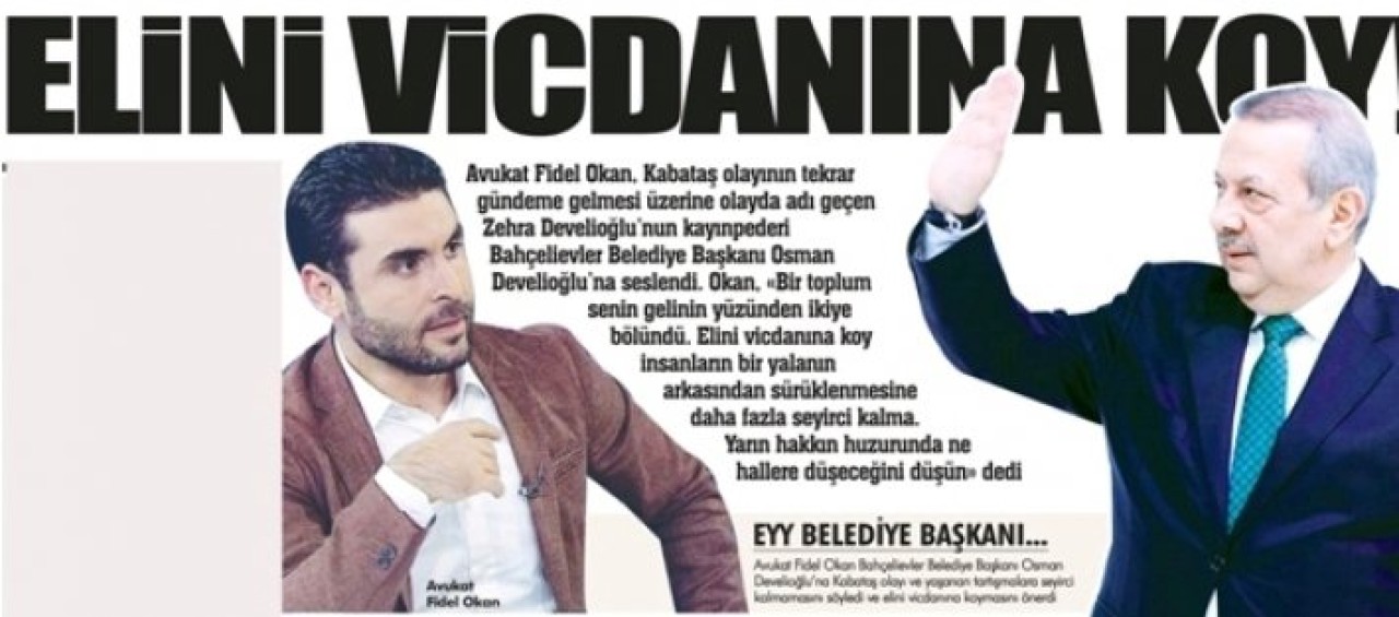 başladığında, ki bu olacak. Savunacak hiçbir şeyi kalmayınca 'Kabataş Yalancısı' olarak ömrünün sonuna kadar o gelinle beraber anılacak. Tüm bunlar yaşanmadan belki yapacağı son bir şey vardır. Basit bir şey. Sadece bir özür" ifadelerini kullandı. Fidel Okan geçen hafta yaptığı ilk açıklamada, Bahçelievler Belediye Başkanı Osman Develioğlu'nun gelininin eşini beklediği sırada kucağında 6 aylık bebeği ile Kabataş'ta saldırıya uğradığı iddialarının, kurgu ve düzmece olduğunu belirterek tartışma başlatmıştı. Fidel Okan' "Bir süre sonra Fuat Avni DM haberi de tıpkı Kabataş yalanı gibi karşımıza heyyula gibi dikilecek" ifadelerini kullanmıştı.