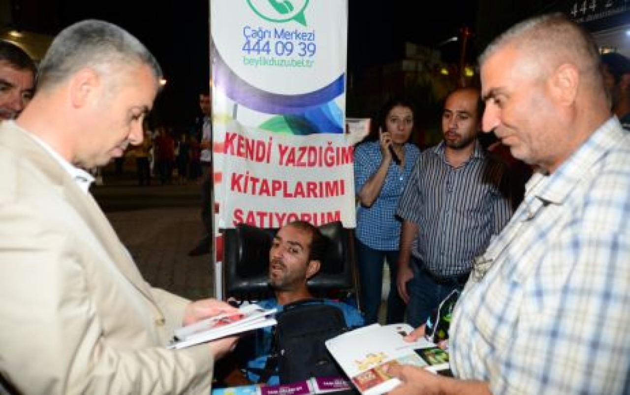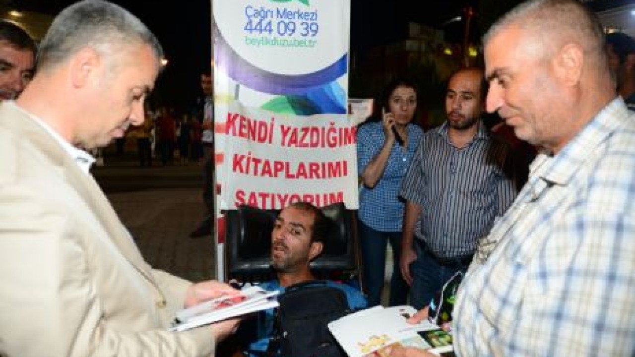 Doğuştan engelli olan 38 yaşındaki yazar Erdal Yalçın, yazdığı kitabın satışını Ramazan Ayı boyunca Beylikdüzü Belediyesi Etkinlik Alanı’nda kendisi için ayrılan yerde gerçekleştirdi. Öykü, şiir, hikaye, tiyatro denemeleri alanında 11 kitap yazdığını, yazdığı eserlerin Cumhurbaşkanlığı’nın oluşturduğu engelli yazarların yazdığı eserlerin bulunduğu kitapta da yer aldığını ifade etti. Üniversiteyi bitirerek, milletvekili olmayı hedeflediğini dile getiren Yalçın, bu şekilde engellilerin yaşadığı sıkıntıların çözümüne de daha çok katkı sağlayacağına inandığını belirtti. Engellilere son yıllardan önemli desteklerin de olduğunu ifade eden Yazar Yalçın, bu desteklerin daha da artmasını istediklerini vurguladı. Beylikdüzü Etkinlik Alanı’nda kendisine kitapseverlerle bir arada olma fırsatı tanıdığı için Beylikdüzü Belediye Başkanı Yusuf Uzun’a da teşekkür eden engelli yazar, Başkan Uzun’a yazdığı kitaplardan hediye etti.