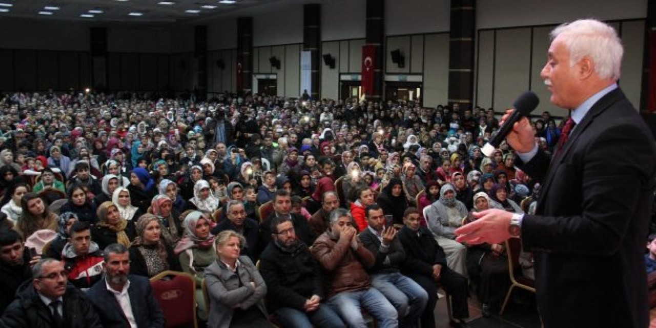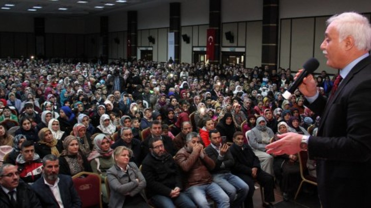 Esenyurtlulara seslenen Nihat Hatipoğlu, “Hz. Peygamber doğduğu gün, 18-20 yaşlarındaki annesi Hz. Âmine diyor ki; ‘doğum saati geldiğinde ortalıkta ben kanat sesleri duyuyorum. Ortalığı birden nur kapladı Resulullahı doğururken. Ortalığı bir nur kapladı Hz. Peygamber doğduğu vakit’ diyor. Resulullahı alıyorlar ve kundağa sarıyorlar. Tabi o gece olağanüstü şeyler olmuş. İranlıların bin yıllık ateşi sönüyor, çünkü İranlılar ateşe tapıyordu o zamanlar. Ateş sönüyor, Sabe diye bir göl var o göl kuruyor, o gölde yıkanan güya cennete girermiş, o göl kuruyor tamamen. Dünyada olağanüstü şeyler oluyor” şeklinde konuştu.
