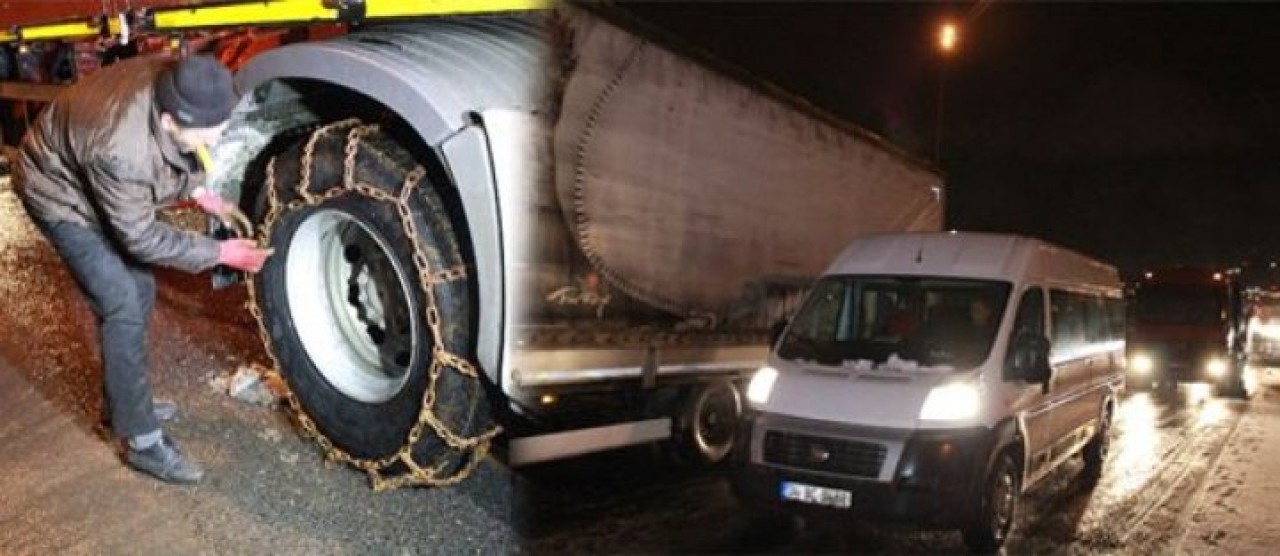 TEM Otoyolu İSTOÇ mevkinde aniden bastıran kar yağışı ve tipi nedeniyle oluşan buzlanma sonucu bazı araçlar yolda kaldı. Gece saatlerinde kar yağışının şiddetlenmesi üzerine beyaza bürünen yolda kar lastiği olmayan bazı araçlar yolda kaldı. İlerlemekte zorlanan ağır tonajlı TIR’lar da yolda durmak zorunda kaldı. Yoldaki buzlanma nedeniyle TIR sürücüler araçlarını tekrar hareket ettirmekte zorlandı. Bunun üzerine sürücüler çareyi zincir takmakta buldu.