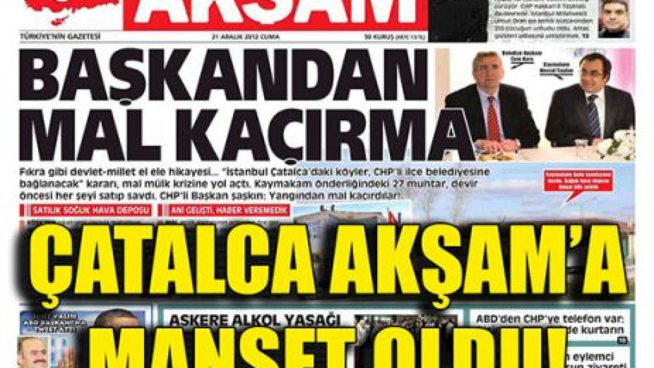 İstanbul Çatalca'da ilginç tartışma...İşte Çatalca Belediyesi'ni kızdıran olayın öyküsü: Cumhurbaşkanı Abdullah Gül'ün iki hafta önce '6360 Sayılı' Büyükşehir Yasası'nı onaylamasıyla birlikte köylerin, belediyelere bağlanma süreci başladı. Çatalca'da da 27 köy mahalle olarak Çatalca Belediyesi'ne dahil oldu. Köylerin belediyeye bağlanmasından kısa süre sonra ilginç bir durum ortaya çıktı. Muhtarlıklara gelir getiren ortak malların yasa çıkmadan iki hafta önce satıldığı anlaşıldı. Köy muhtarlarının tamamının satışa karar verdiği, Kaymakam Nevzat Taşdan'ın da 36 kişilik 'İhale Komisyonu' kurup malları sattığı öğrenildi.
