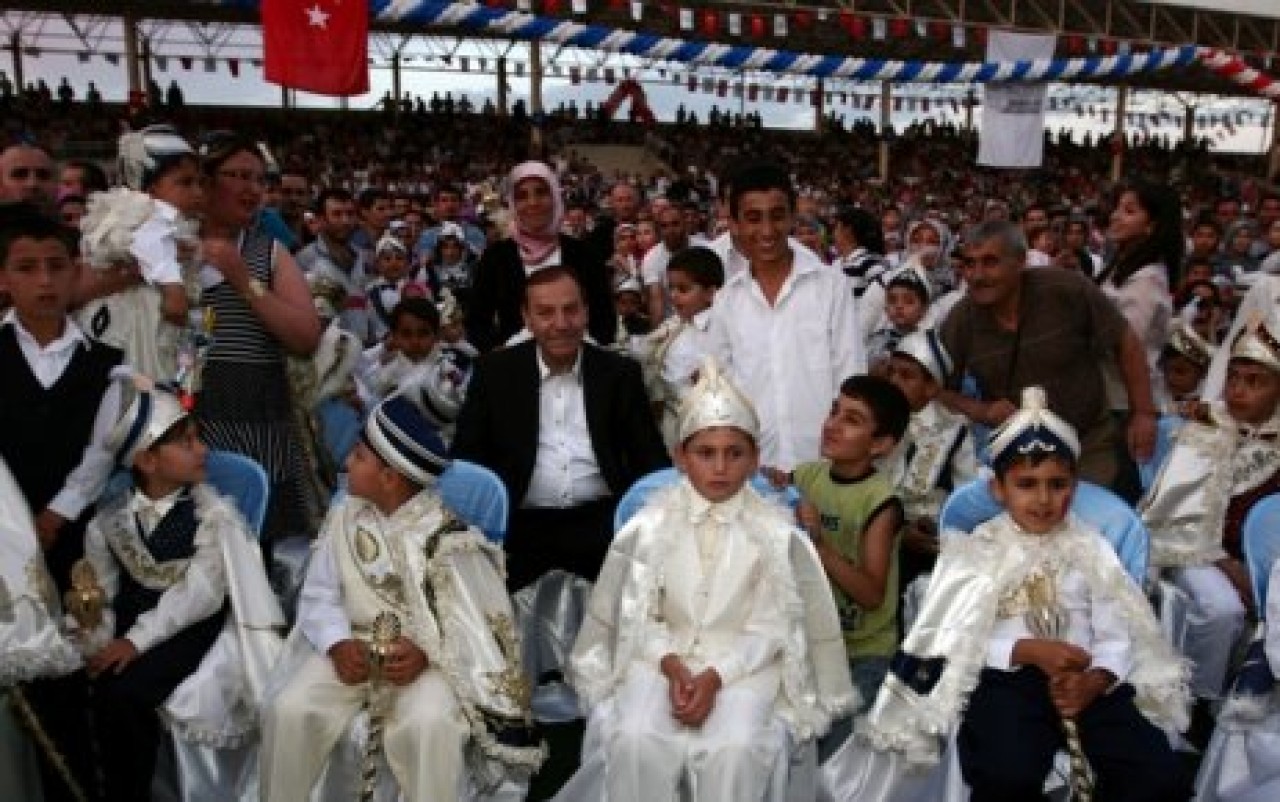 Evliliğe adım atan genç çiftler ve sünnet olmanın heyecanını yaşayan çocukların, stad içinde ayırılan bölümde yerlerini şölen programı istiklal Marşı ile başladı.